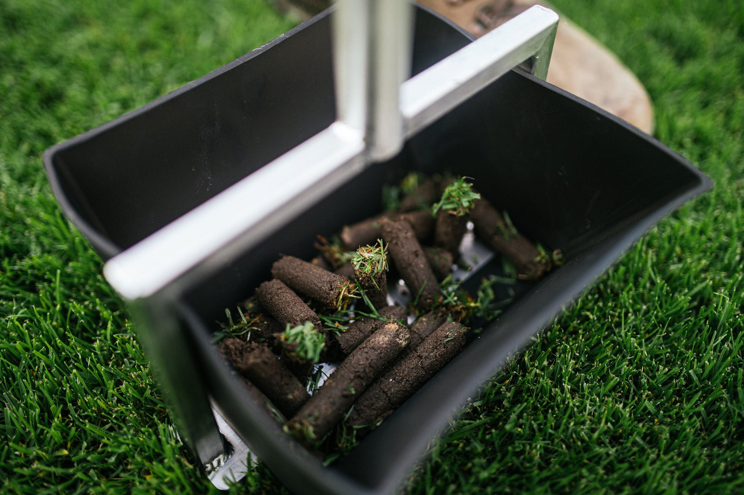 Due to the conical shape of the hollow tine, the cores are collected in the collection tray. This prevents the soil from falling back into the holes and saves you the hassle of picking it up.